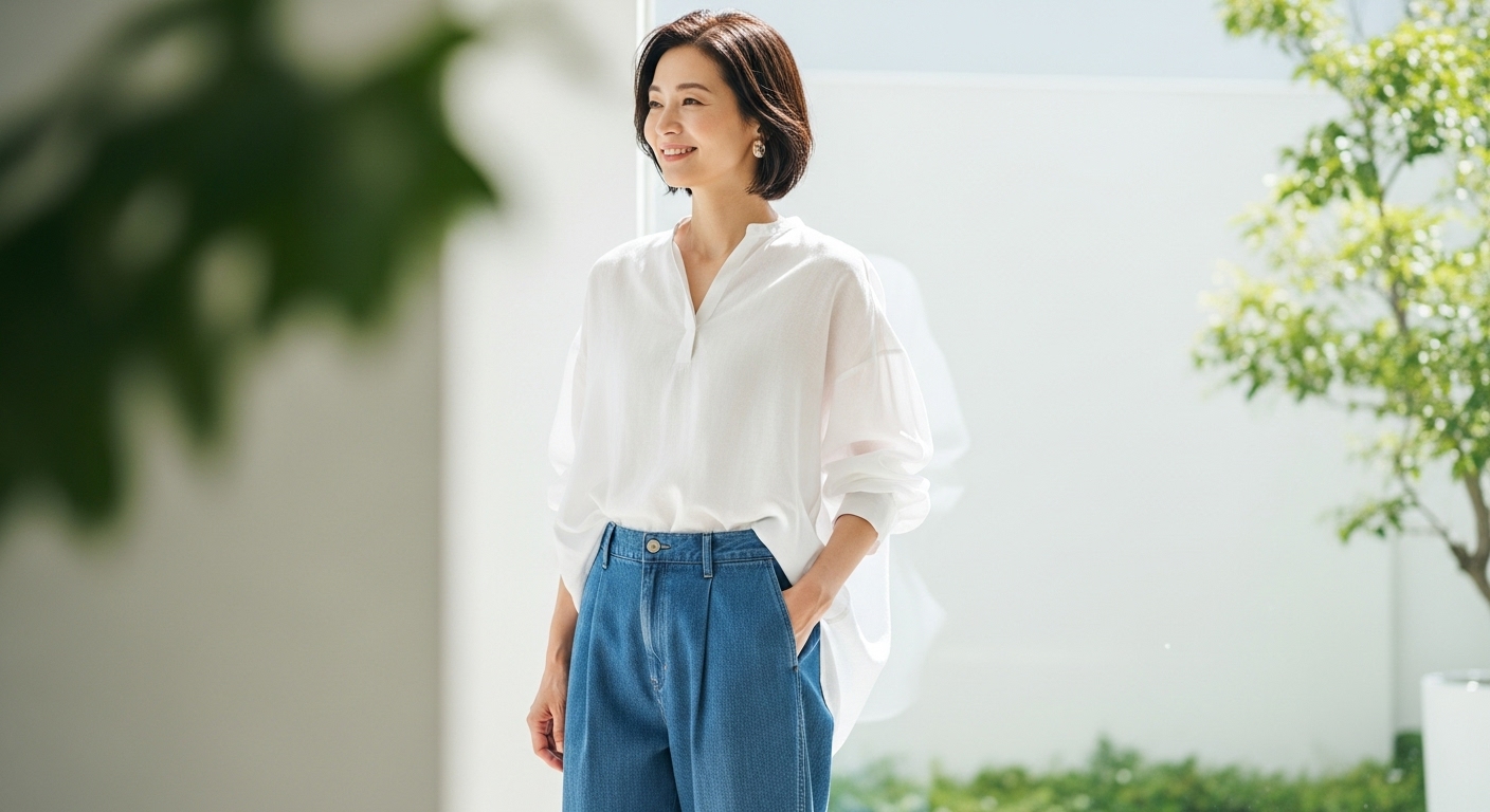 カジュアルシーン、リネンブラウス×デニムの大人コーデ