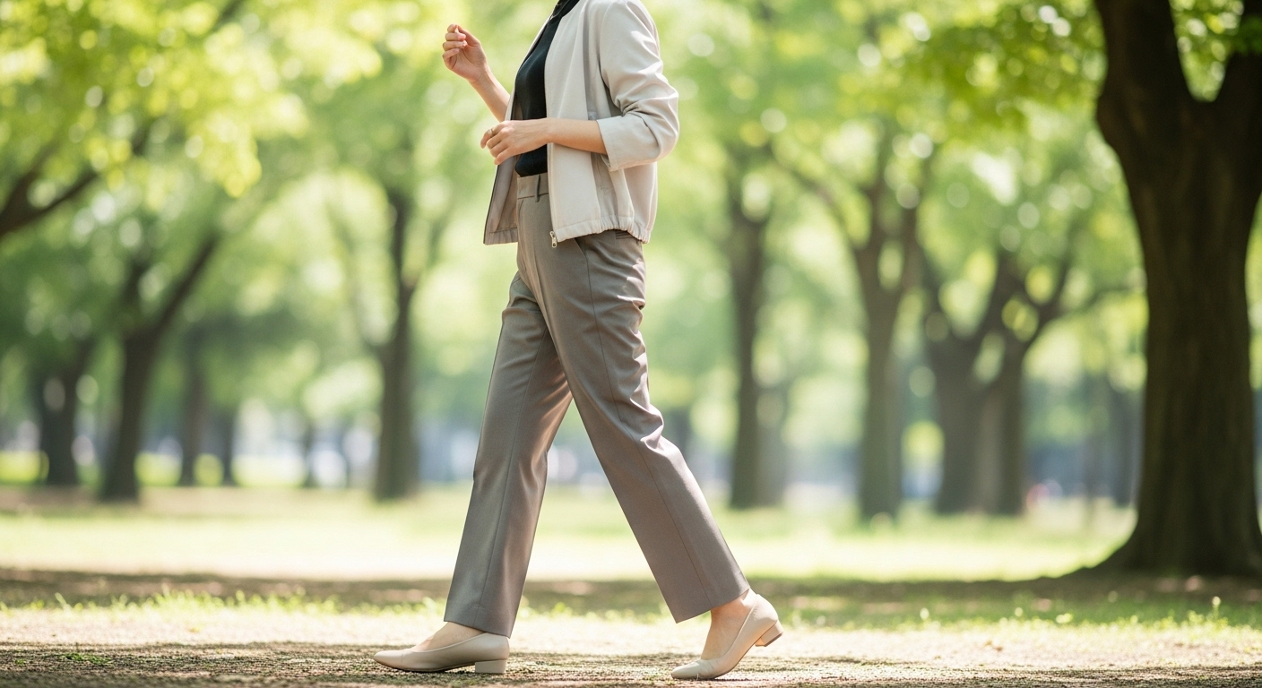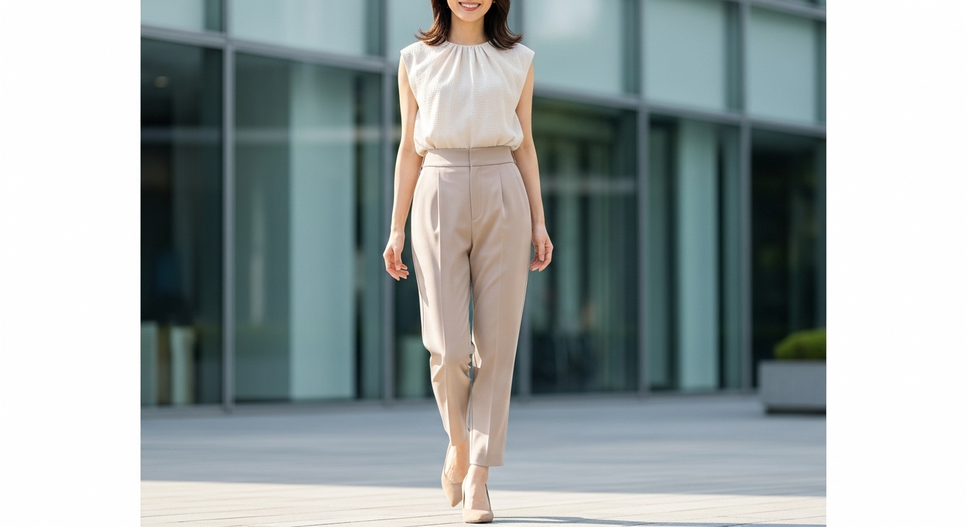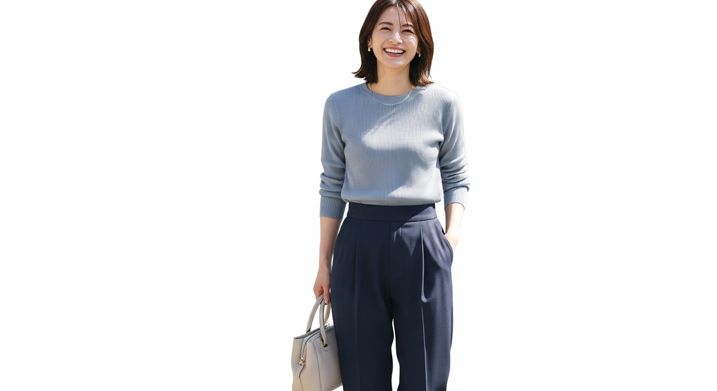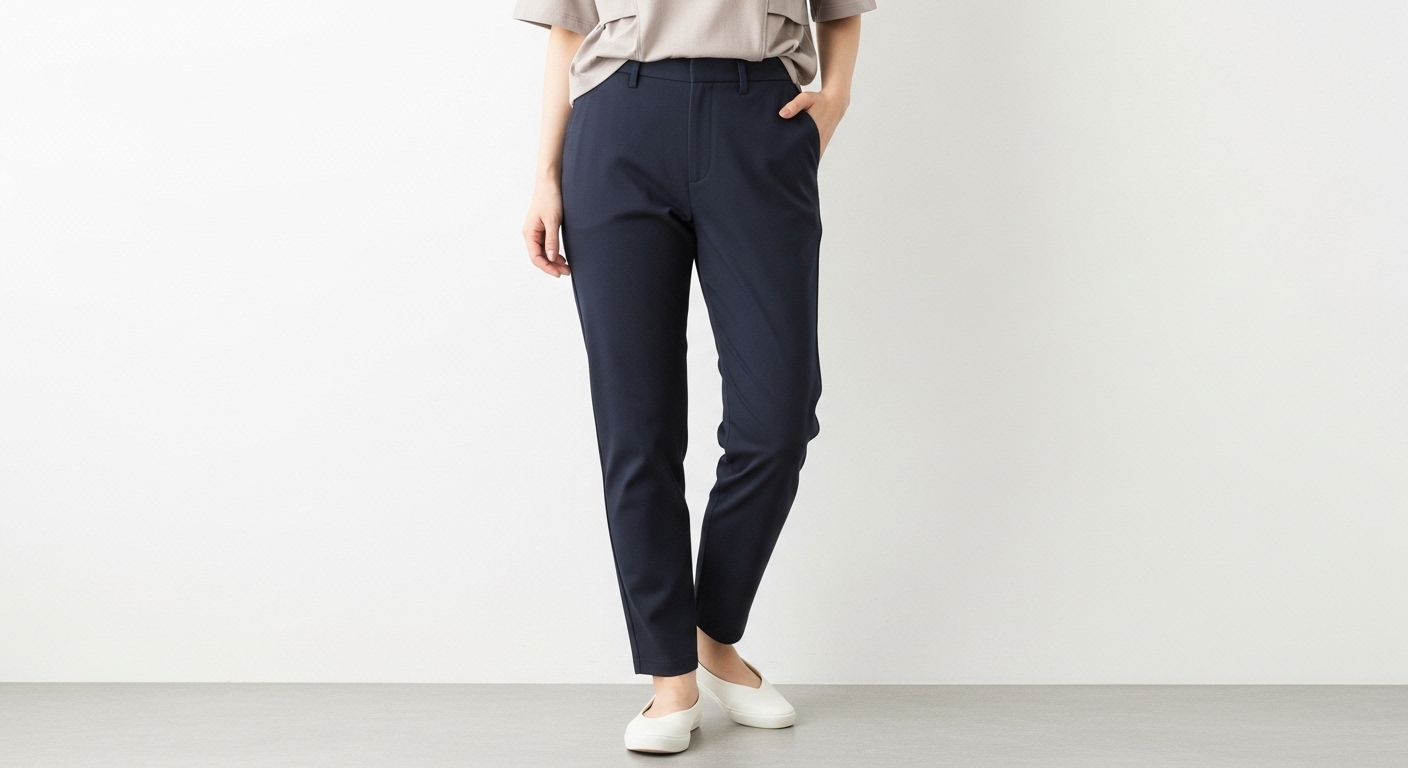 - 太ももやヒップが気になる → センタープレス入りパンツ + 落ち感のある素材