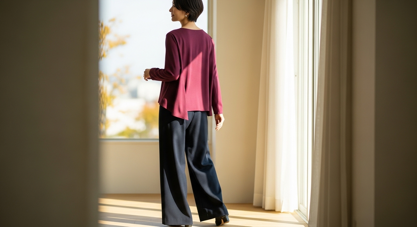 「落ち着いた色を選んだら地味で老けて見える」「厚手の素材で下半身が重たく見える」「重ね着したら着膨れしてしまった」など、秋のパンツ選びには特有の悩みがつきものです。