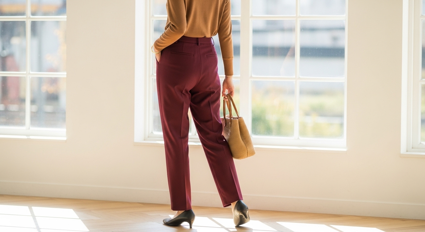 ボルドーやダークネイビーのセンタープレスパンツは、上品さと華やかさを両立させてくれます♪