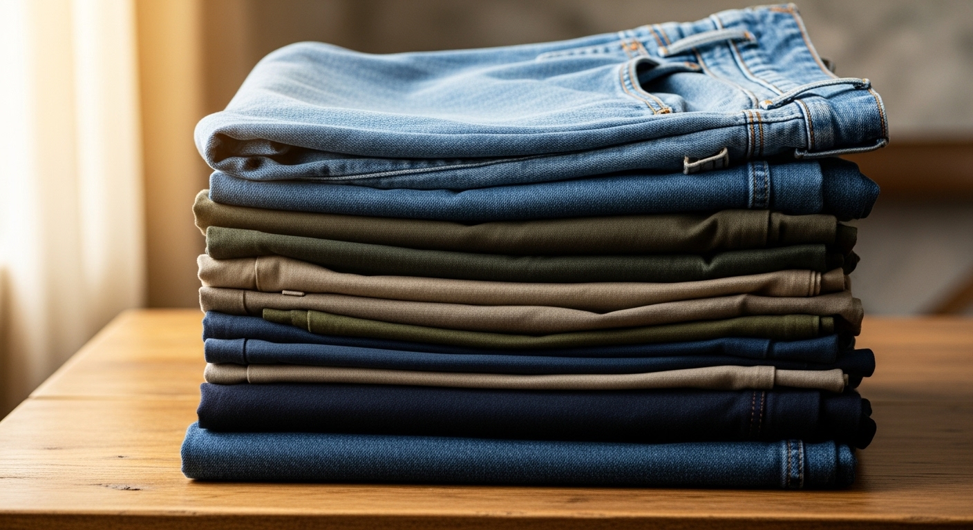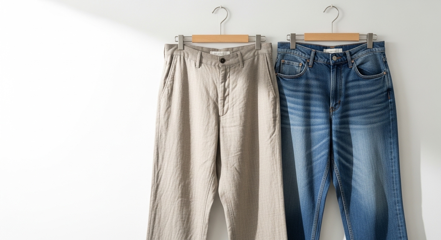 パンツ選びでは、シルエットと同じくらい素材が重要です。