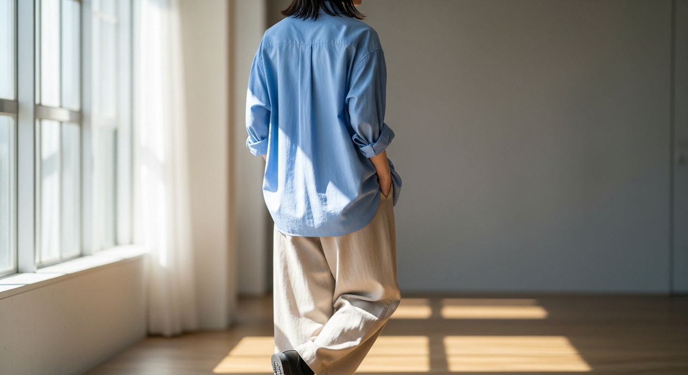 一方、ゆったりとしたトップスなら、肩のフレーム感を自然にカバーしながら、重心を下にずらすことができます。