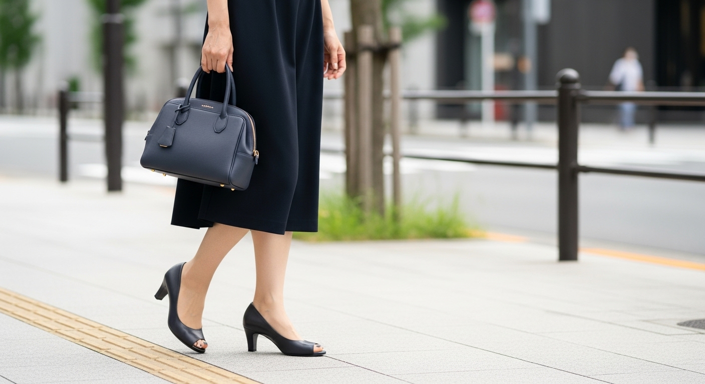 小ぶりのバッグとヒールパンプスで、洗練された印象に。