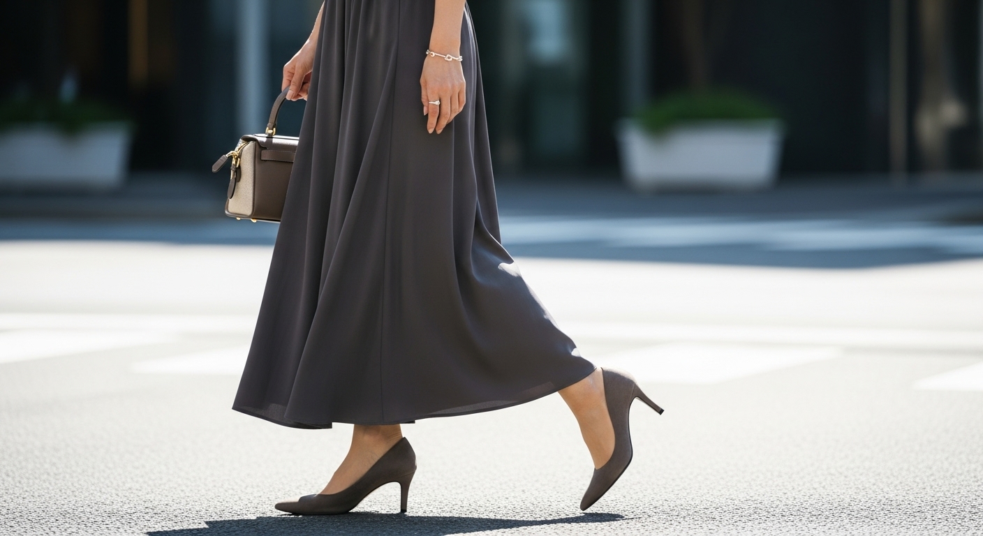ロングスカートには、ヒールのあるパンプスを合わせるとバランスが取れます。