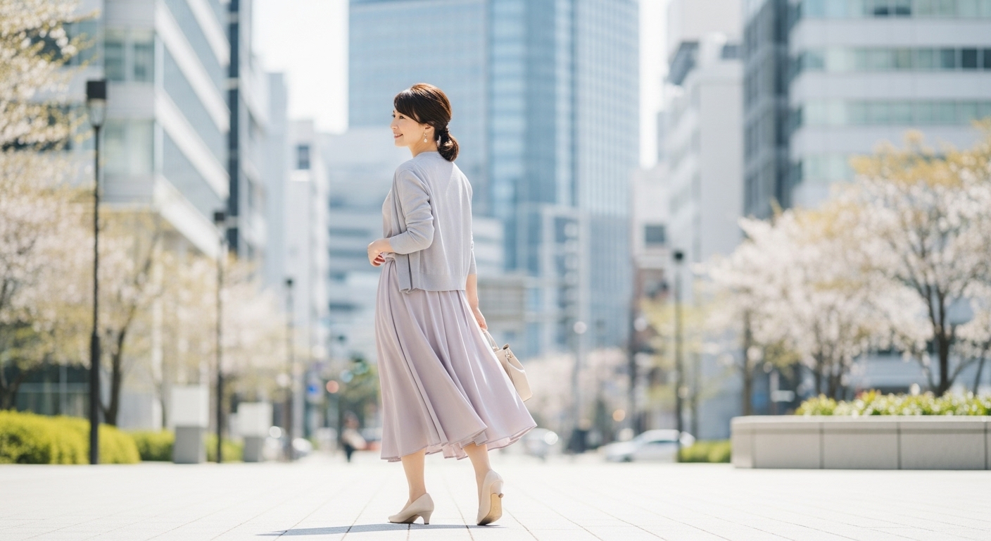 明るすぎる色や甘すぎるデザインは避け、シンプルで上品なスカートを選ぶのがポイントです。