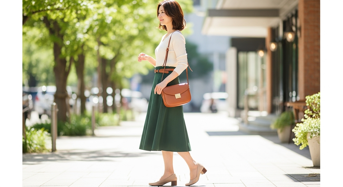 体型カバースカート春の選び方|お腹・太ももをカバーする40代コーデ
