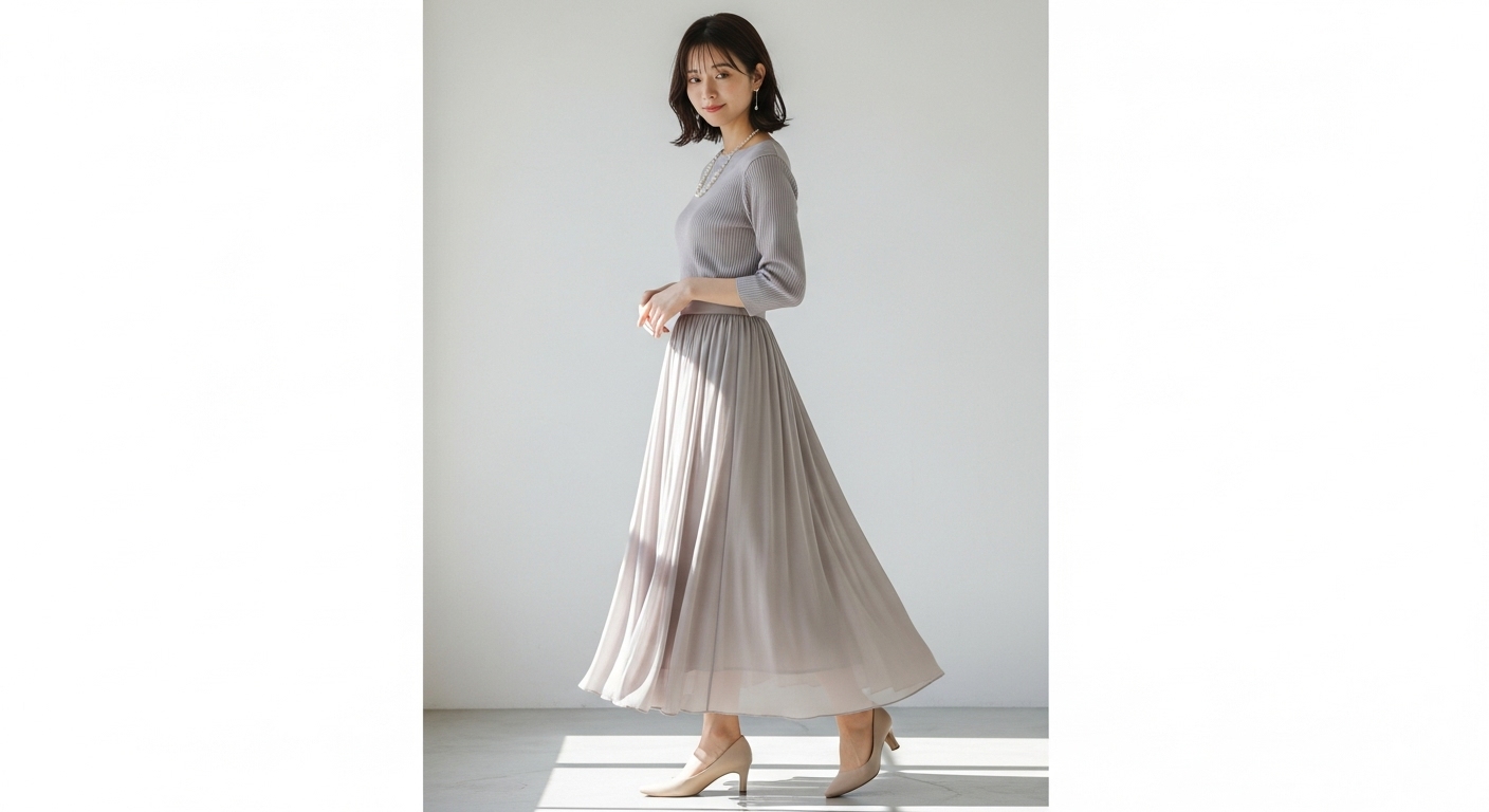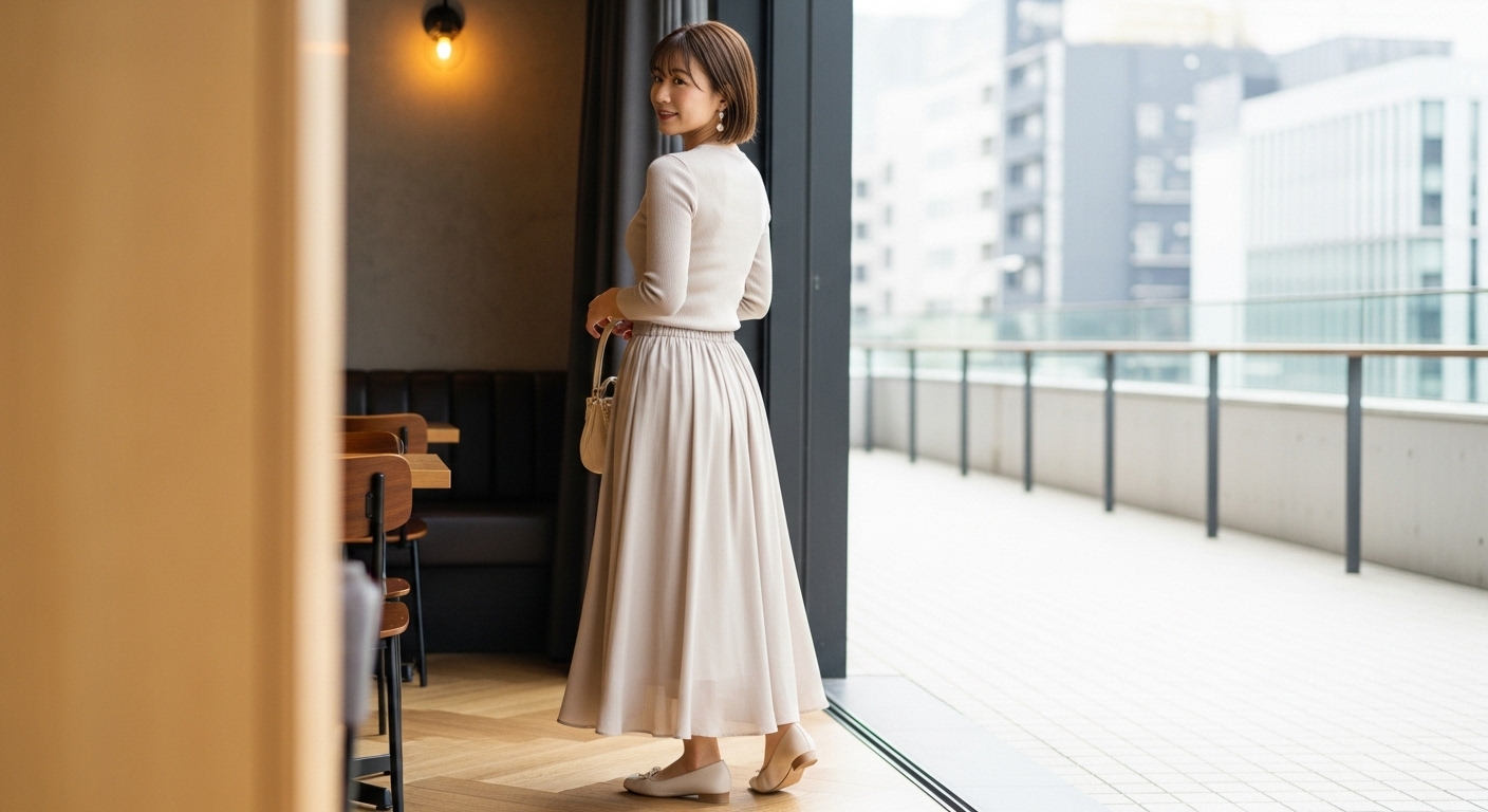 シフォンやとろみのある素材は、体のラインを拾いすぎず、自然に下半身をカバーしてくれます。