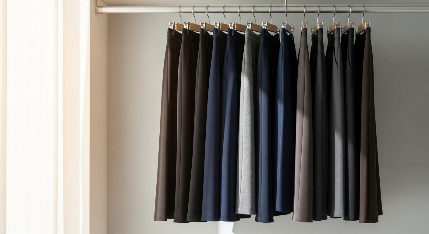 色はダークカラーを中心に、センタープレス入りのデザインを選ぶと着痩せ効果が高まります。