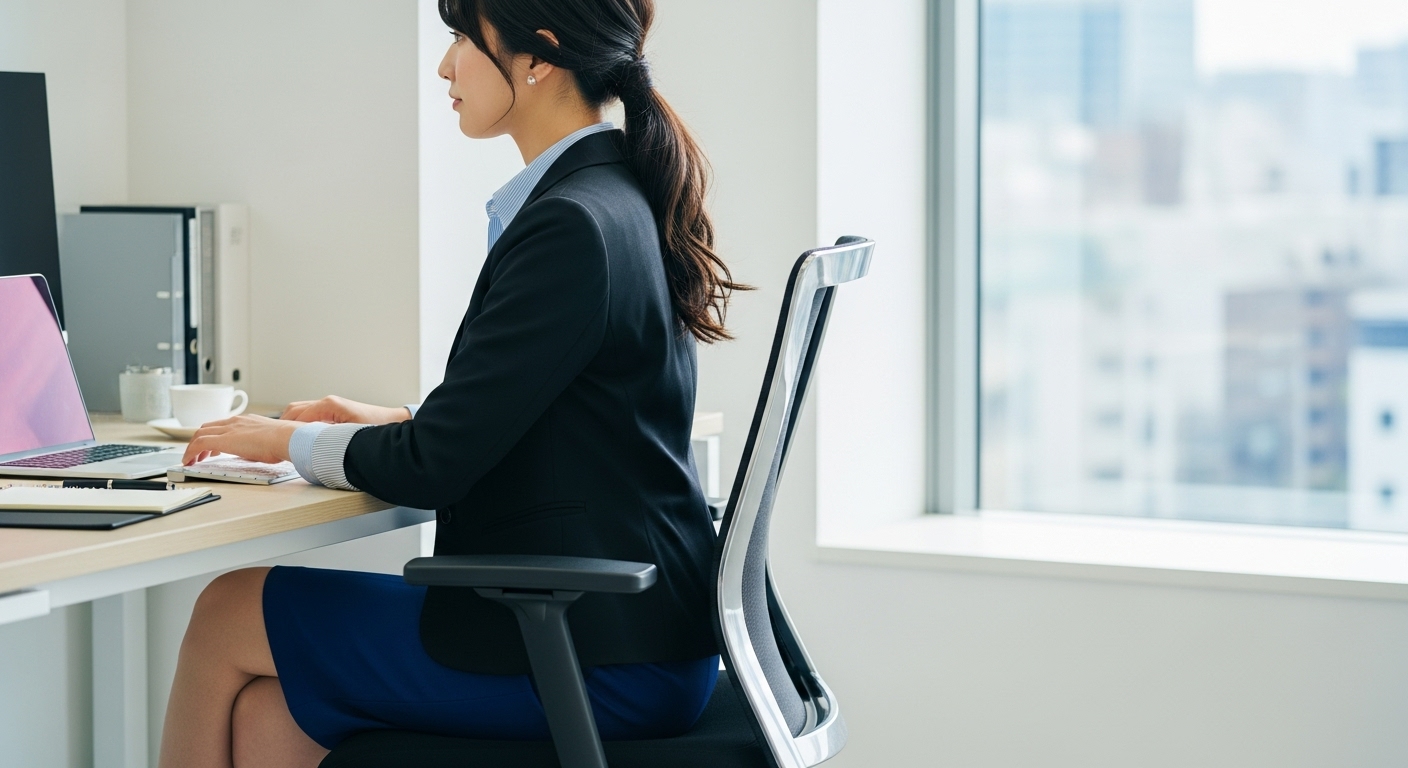 デスクワーク中も、背もたれに寄りかからず背筋を伸ばすことで、体のラインが整います。