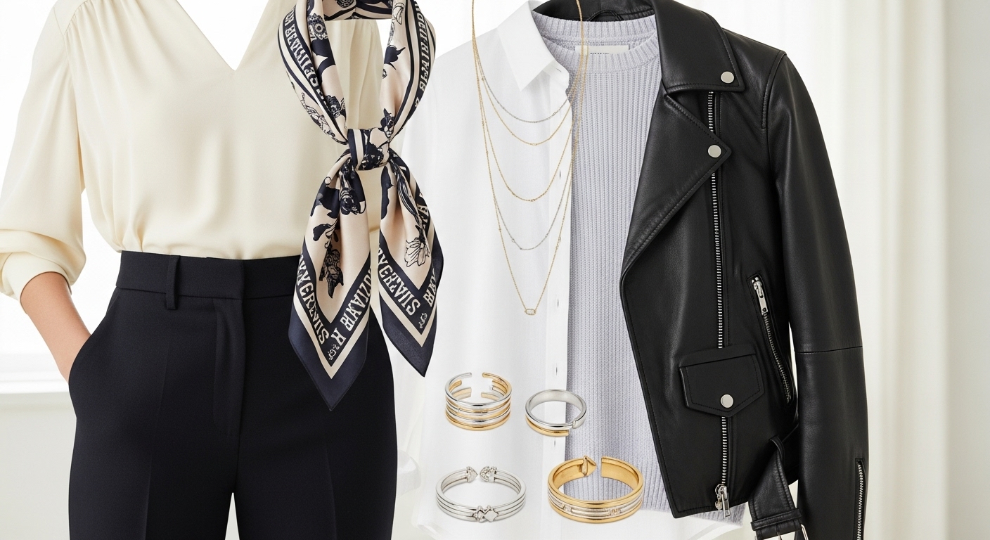 大ぶりのネックレスやイヤリングは、視線を顔周りに集める効果があります。