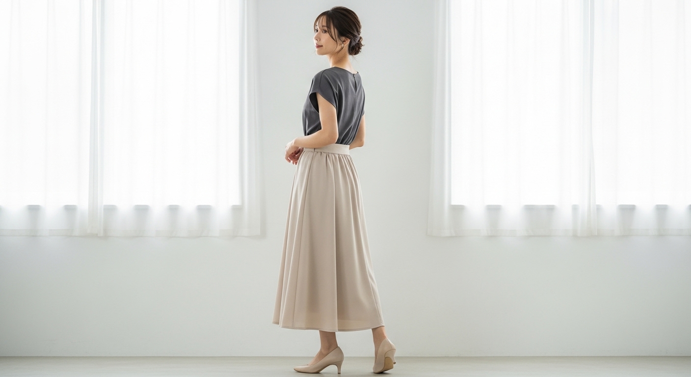膝丈から膝下くらいの長さを選び、ヒールのある靴を合わせると、バランスが取りやすくなります。