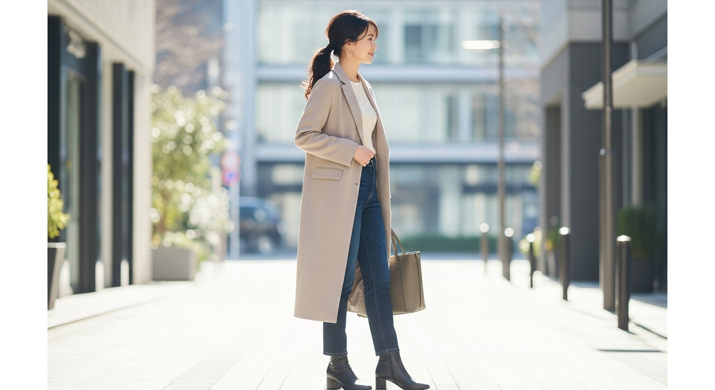 全身のシルエットをIラインにまとめ、縦のラインを強調することがポイントです。