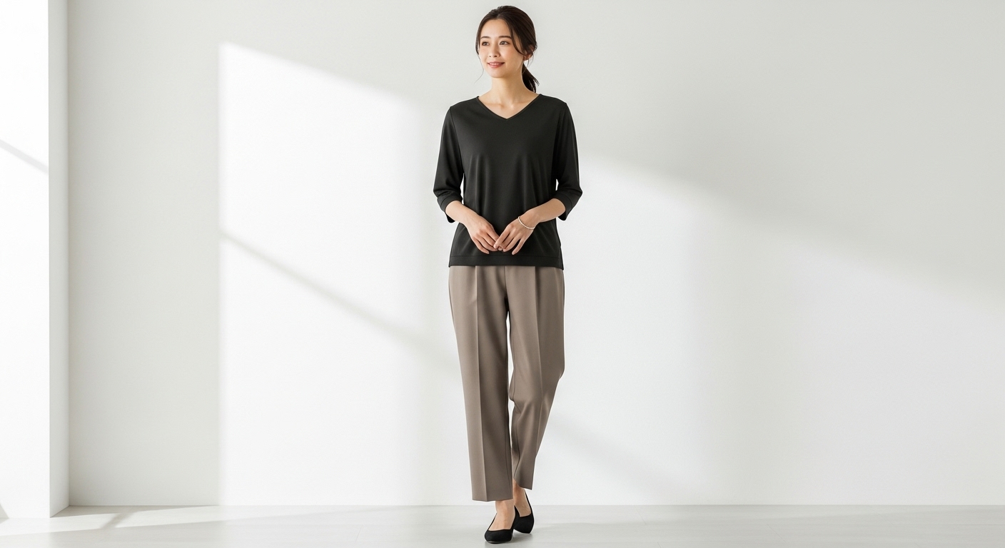 具体的には、Vネックのトップスにストレートパンツを合わせたり、ロングカーディガンで縦ラインを作る方法が効果的!