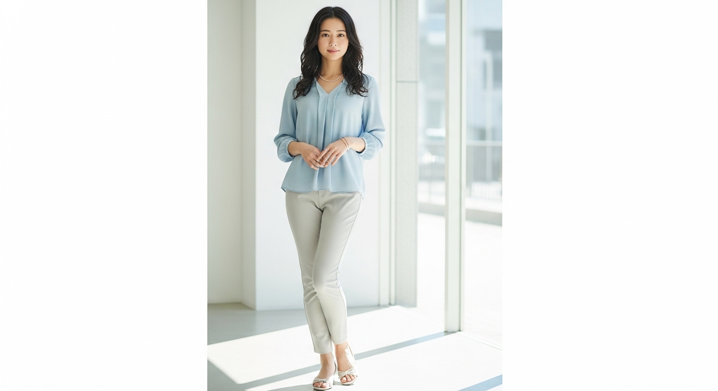 Vネックやロングネックレスで視線を縦に誘導し、横の広がりを目立たなくします。