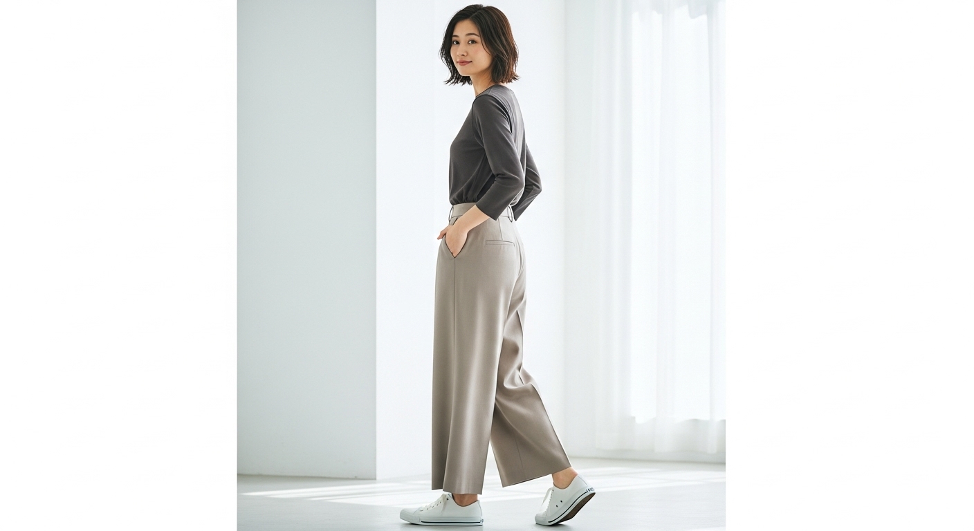 靴下が見えない丈のワイドパンツを選ぶと、一番すっきりした印象になります。