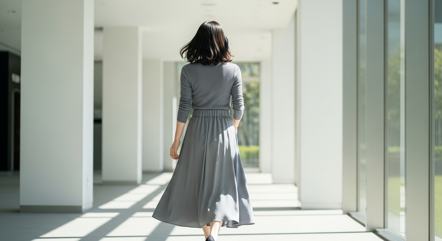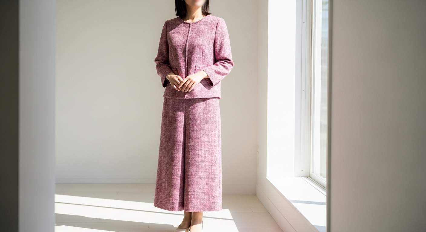 上下が揃っているからこそ生まれる縦のラインや、きちんと感のある印象が、着痩せ効果を高めてくれます。