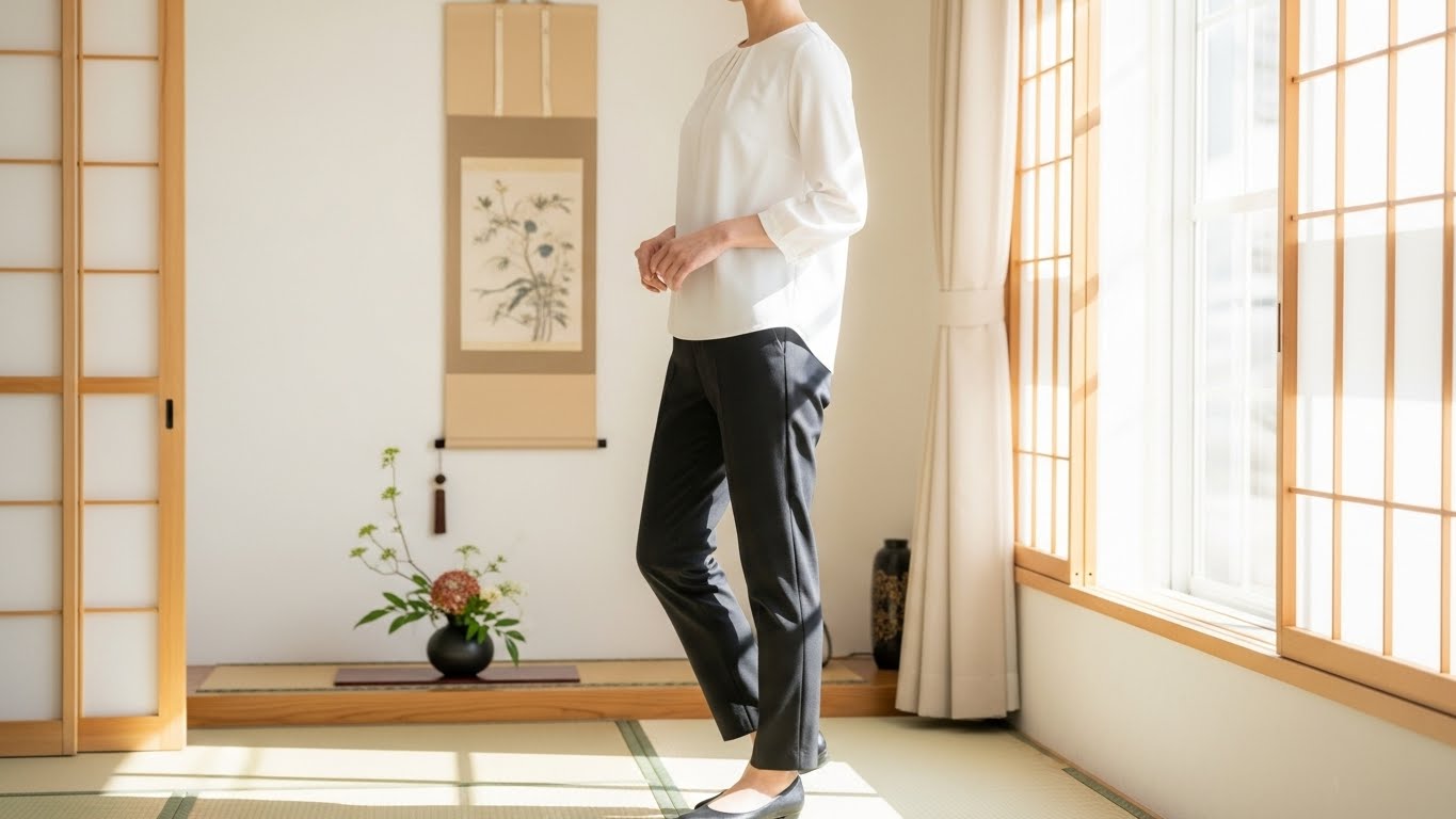 ☑ ボトムス:テーパードパンツまたはAラインスカート