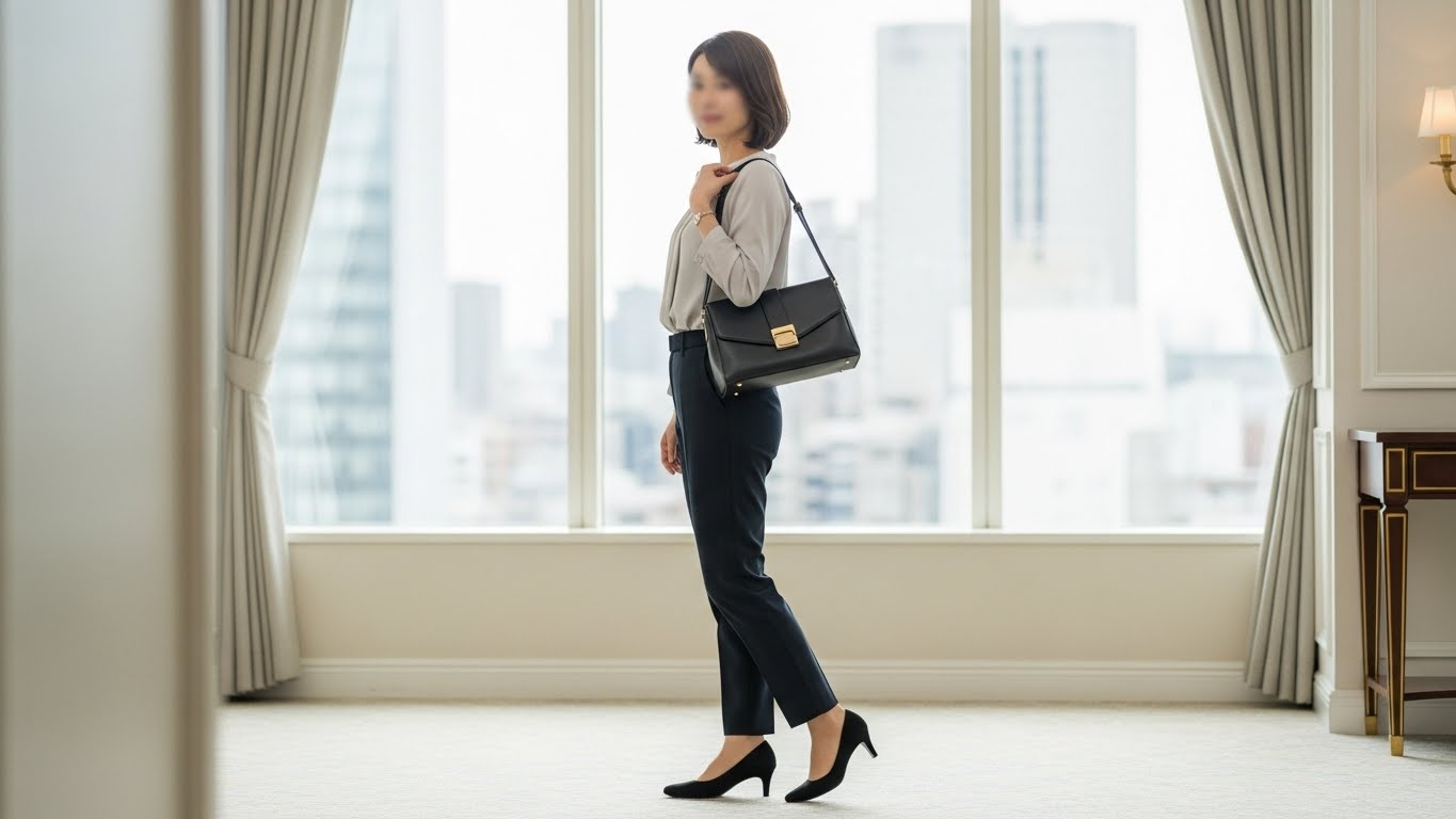 布製のトートバッグより、合皮やレザー調のバッグを選ぶときちんと感が出ます。