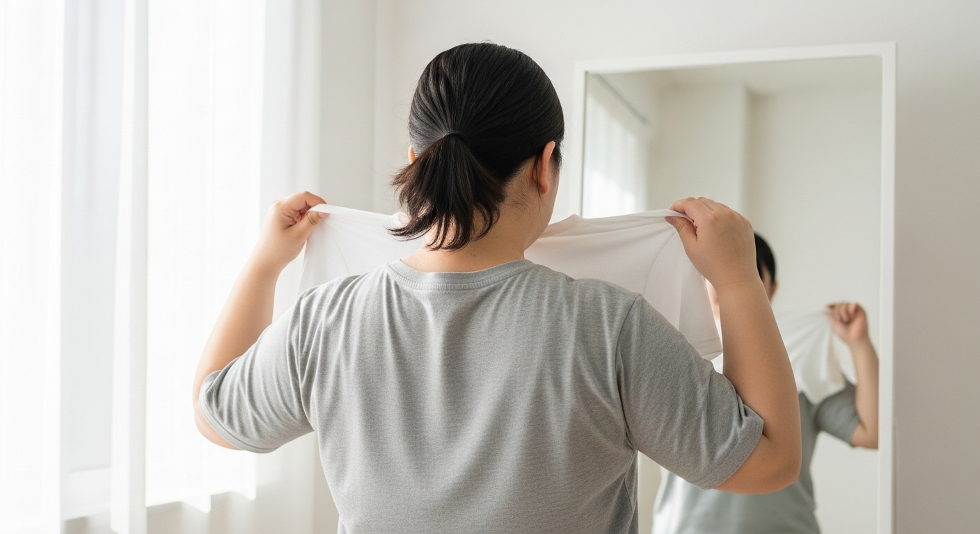 薄手のTシャツは体のラインがはっきり出やすいため、気になる部分が目立ってしまいます。