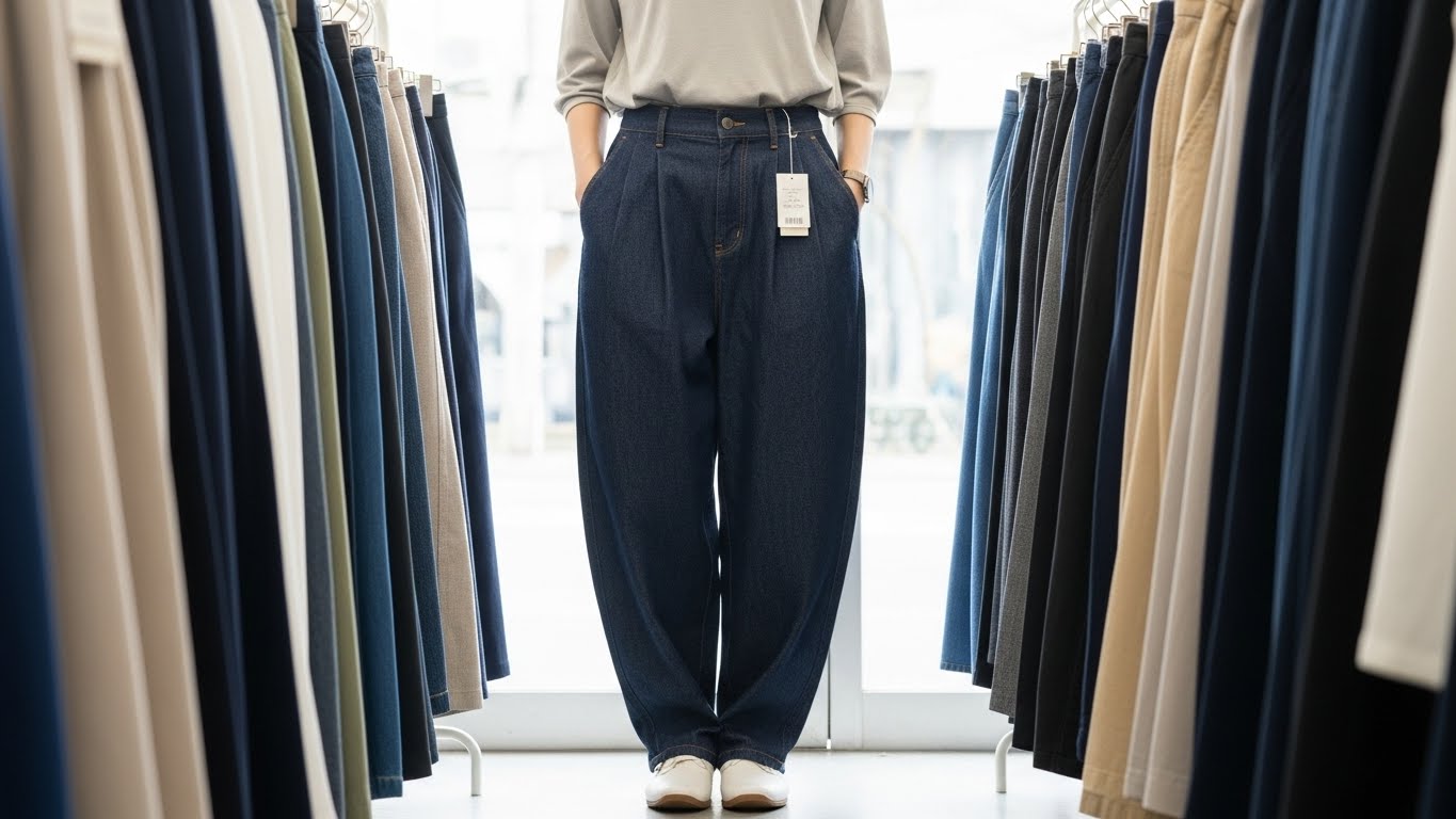 「ワイドパンツ」は幅広パンツの総称で、バギーパンツはその一種にあたります。