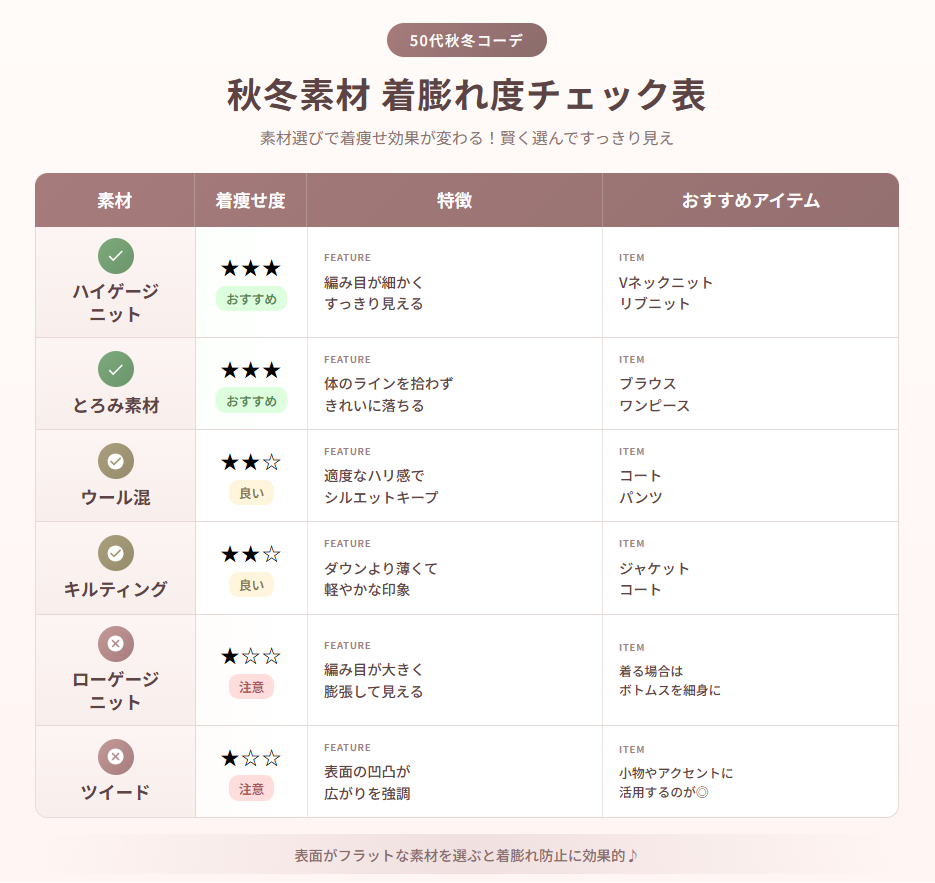 | 素材 | 着痩せ効果 | 特徴 | おすすめアイテム |