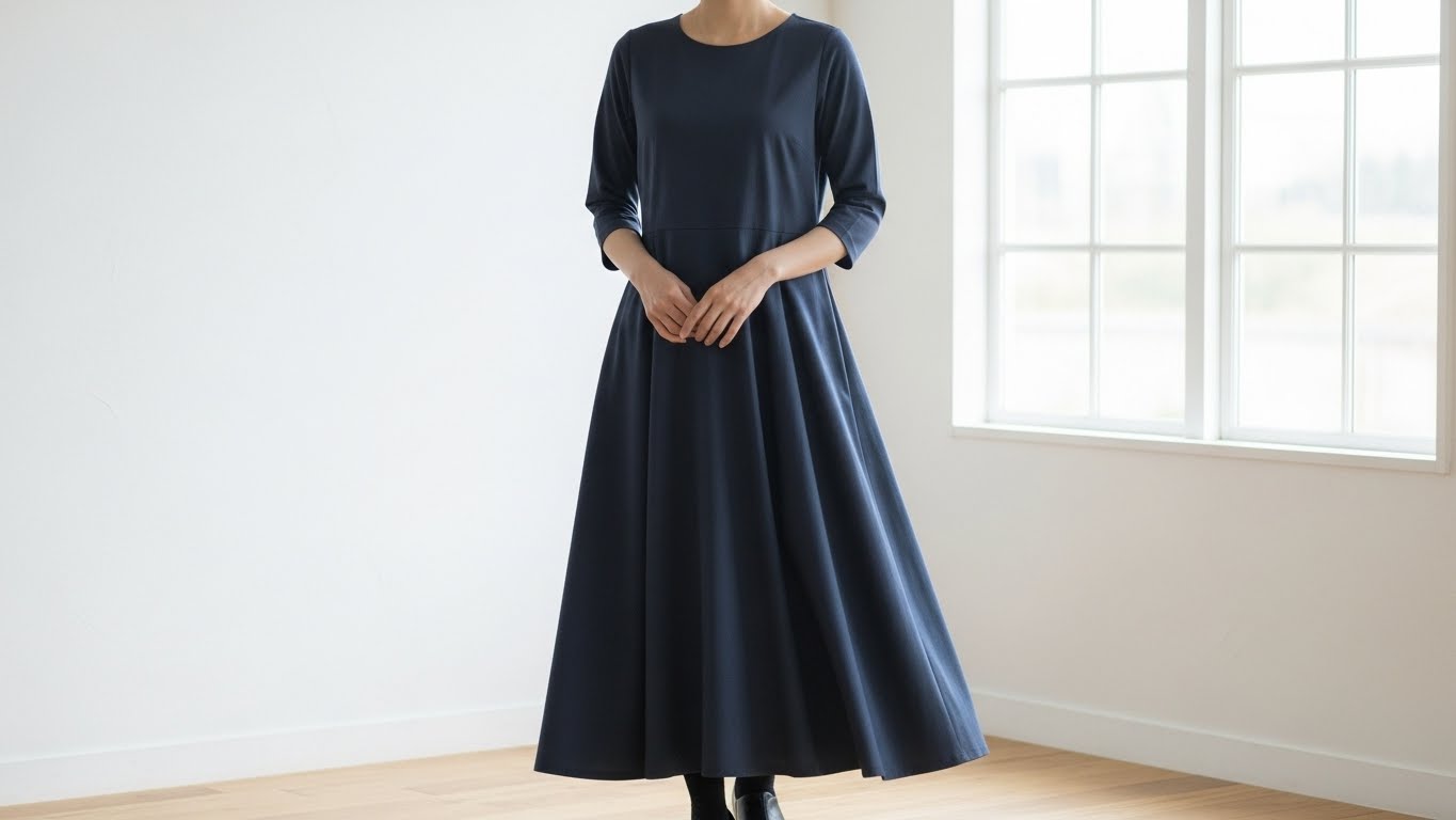 4. 美シルエットで体型カバー!ラウンドネックマキシワンピース