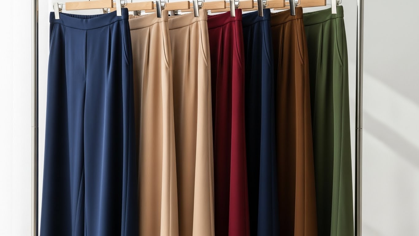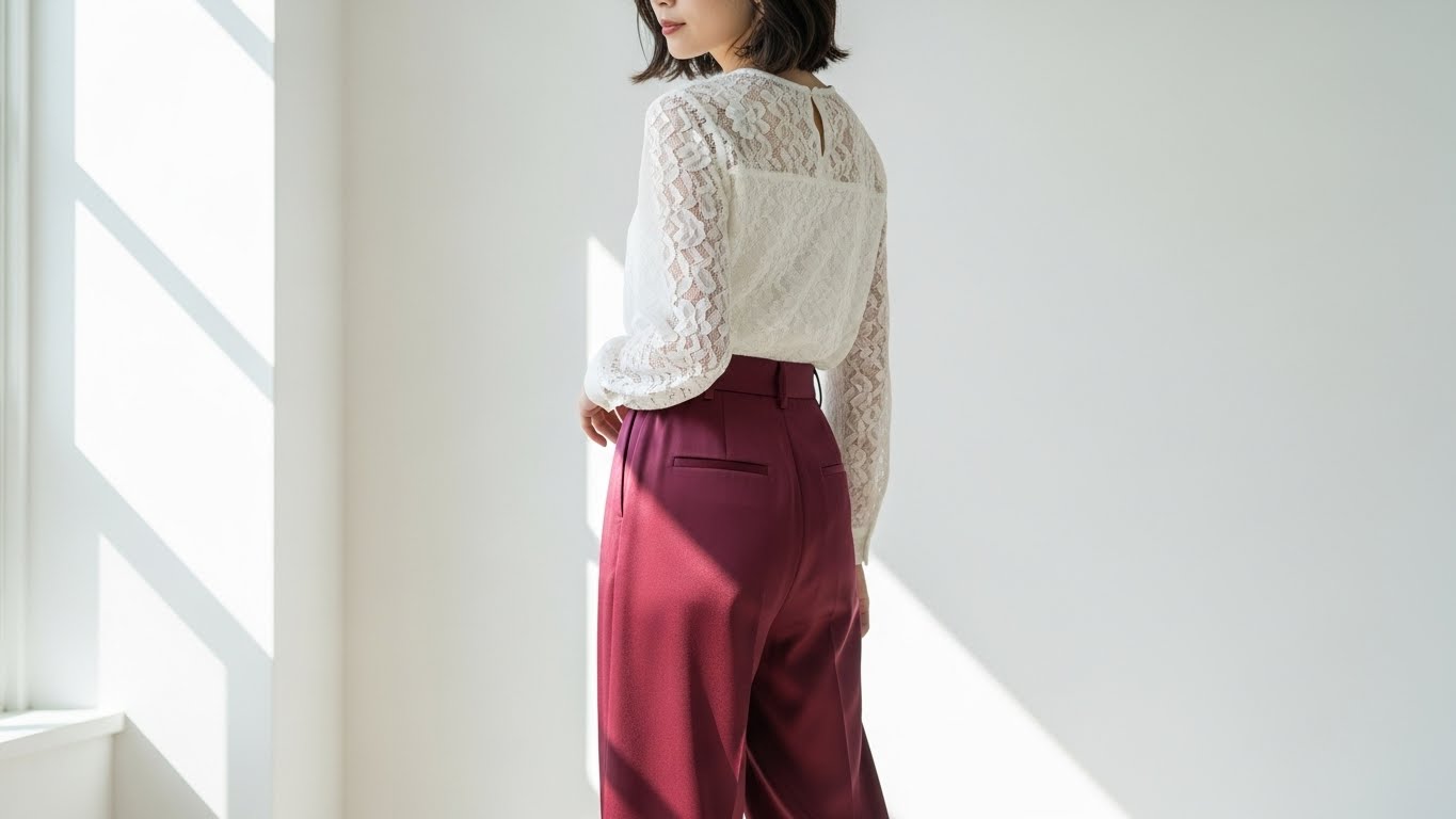 デニムやカジュアル素材は避けて、適度な厚みと光沢感のあるものを選ぶのがポイントです。