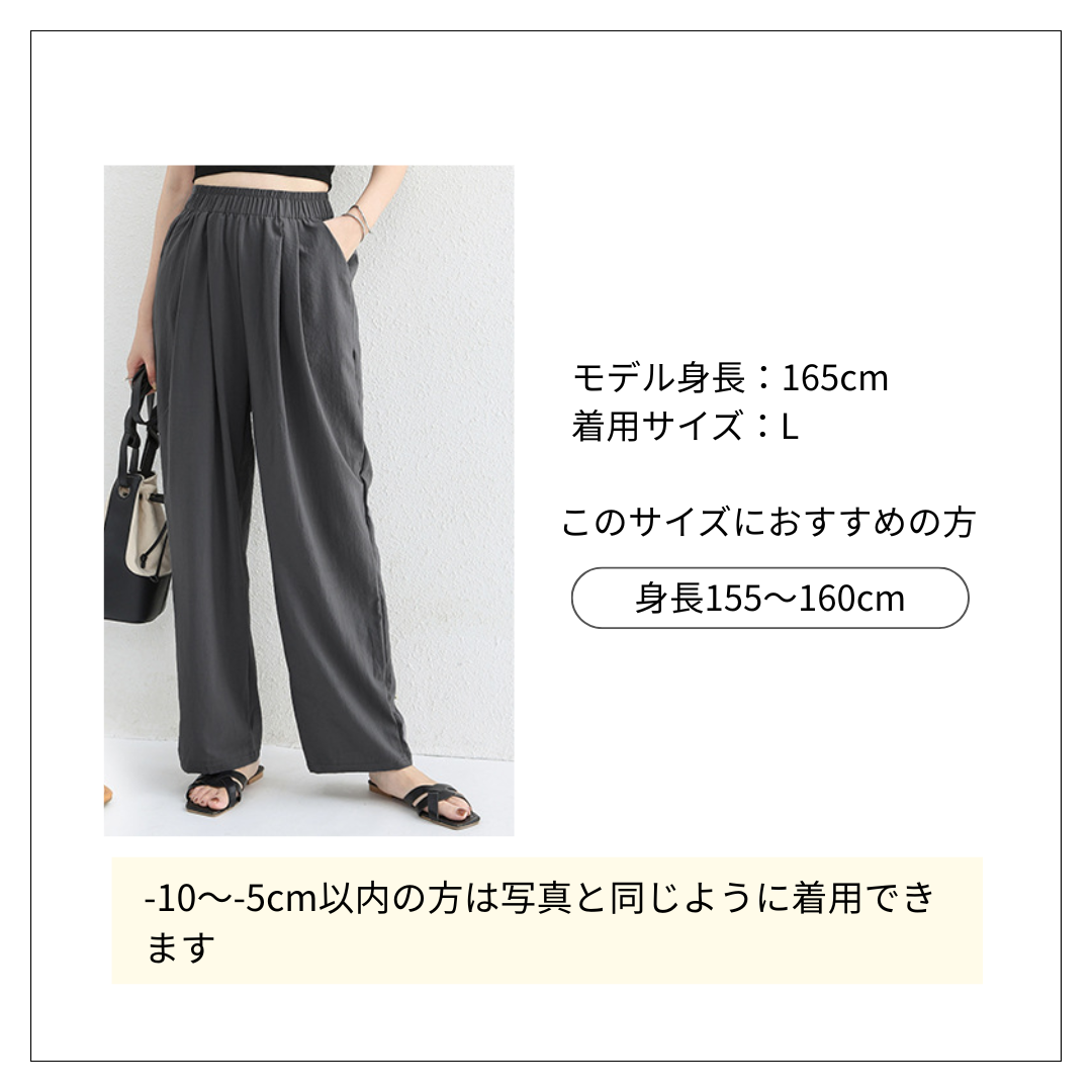 伸縮性のあるウエストで締め付けず快適な履き心地を実現。ゆったりとしたワイドシルエットが気になる下半身をさりげなくカバーし、リラックスした着こなしが叶います。柔らかな素材感で動きやすく、デイリーからリゾートシーンまで幅広く活躍する一枚です。
