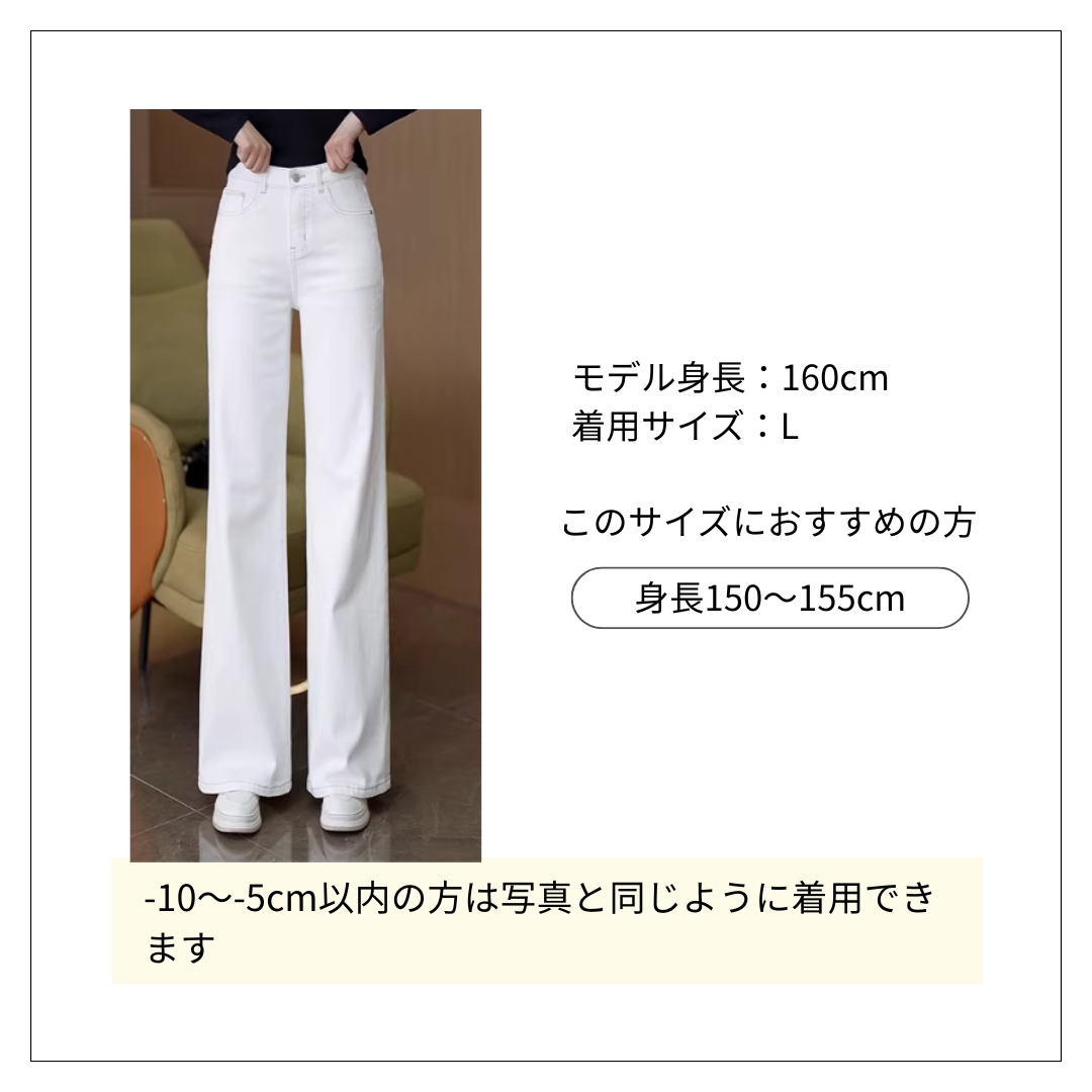 ハイウエストデザインと裾広がりのシルエットで体型カバー効果抜群のデニムパンツ。 余裕のある幅広シルエットで足のラインを拾わず、白色が爽やかな印象を演出します。 上品な雰囲気と快適な着心地を両立した大人の一本です。