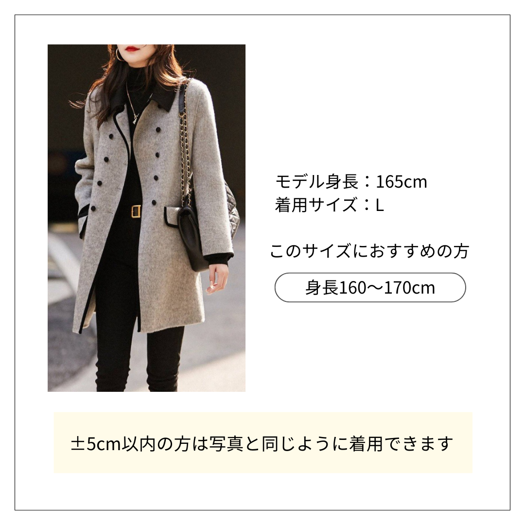 体型カバーをしながら女性らしいシルエットを演出するコートです。 黒の縁取りとダブルボタンが上品な印象を与え、細見えする効果があります。 どんなカラーのトップスとも相性が良く、日常使いからお出かけまで幅広く活躍します。