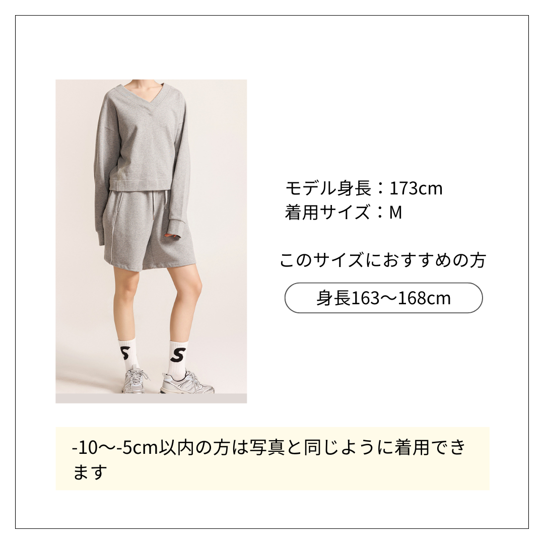 体型カバーが叶うドロップショルダーのトレーナー。 肩線を美しく見せるVネックデザインで上品な印象に。 部屋着としても外出着としても活躍する万能トレーナーです。