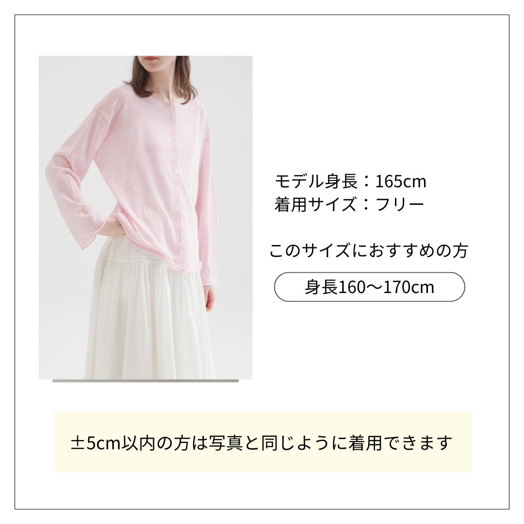 体型カバーに最適な優しい肌触りのカーディガン。 程よいゆとりで気になる部分をさりげなくカバーしつつ、女性らしい柔らかな印象を演出します。 軽やかな素材感で季節の変わり目にも重宝する一枚です。