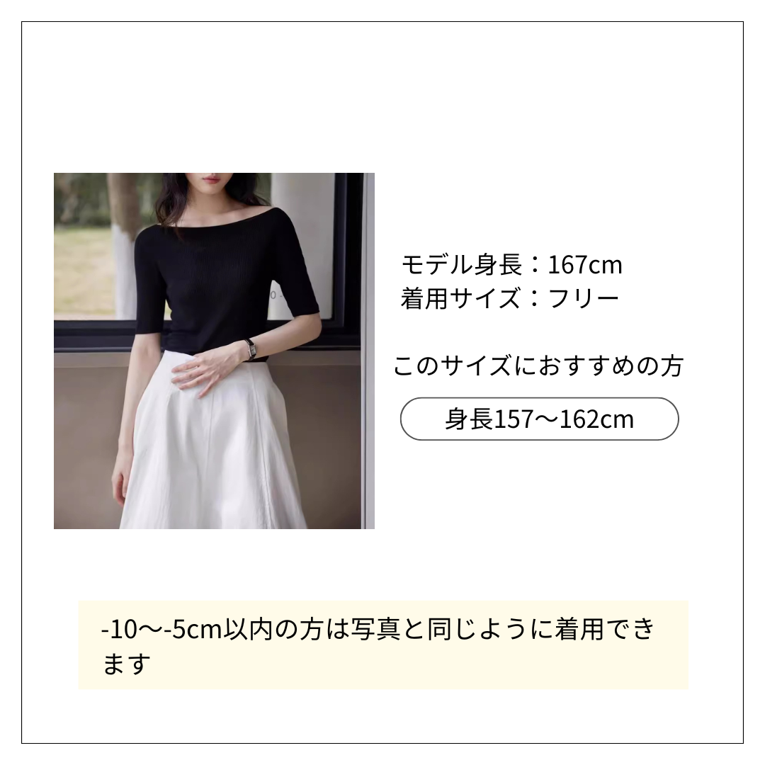 体型カバーが叶うリブ編みのセーター。 肩を美しく見せるボートネックと、二の腕をすっきり見せる五分袖デザイン。 上品な着こなしを演出しながら、さりげなく体型をカバーします。